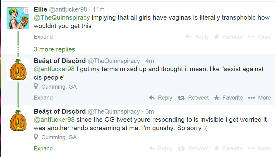 b4 we assume things may i propose that perhaps she is just unfamiliar with the term? if you looked at the term “cissexist” without any previous knowledge u might liken it to “sexist against cis people” or something (which isnt what it means obviously but i literally thought that the first time i saw the term)